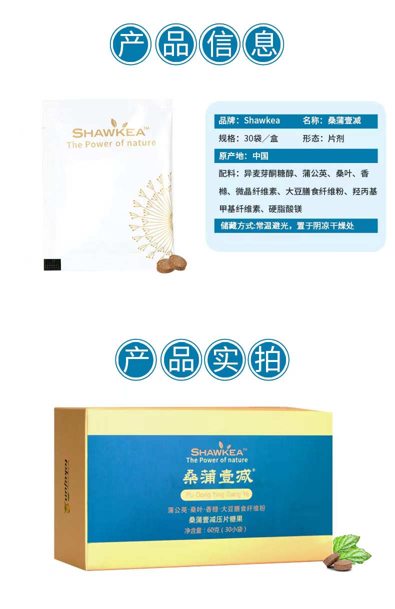 shawkea桑蒲壹减是一款富含蒲公英提取物、桑叶提取物等天然成分的食品。